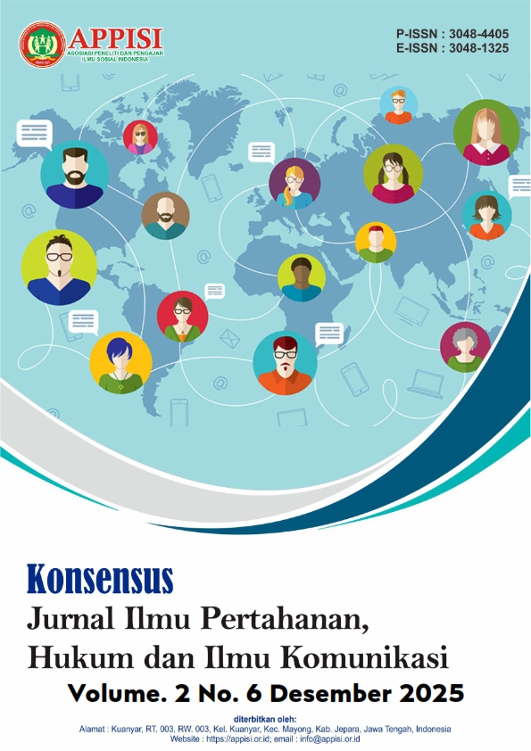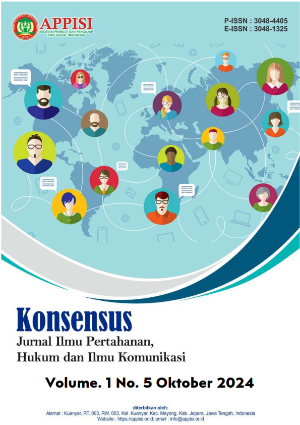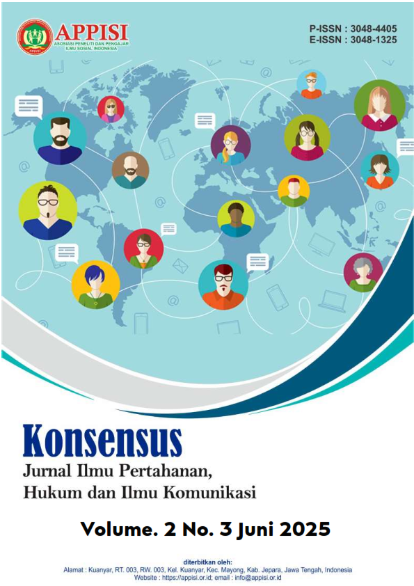 Konsensus : Jurnal Ilmu Pertahanan, Hukum dan Ilmu Komunikasi adalah jurnal akademik yang diterbitkan oleh Asosiasi Peneliti Dan Pengajar Ilmu Sosial Indonesia. Jurnal ini mempublikasikan penelitian orisinal tentang berbagai konsep, teori, perspektif, paradigma dan metodologi dalam kajian Politik, Pertahanan, Hukum dan Ilmu Komunikasi. Topik yang diminati dalam Jurnal KONSENSUS : Jurnal Ilmu Pertahanan, Hukum dan Ilmu Komunikasi khususnya meliputi kajian Komunikasi, Politik, Pemerintahan, Hubungan Internasional, Hukum, dan Sosial. Jurnal ini terbit 1 tahun 6 kali (Februari, April, Juni, Agustus, Oktober dan Desember).